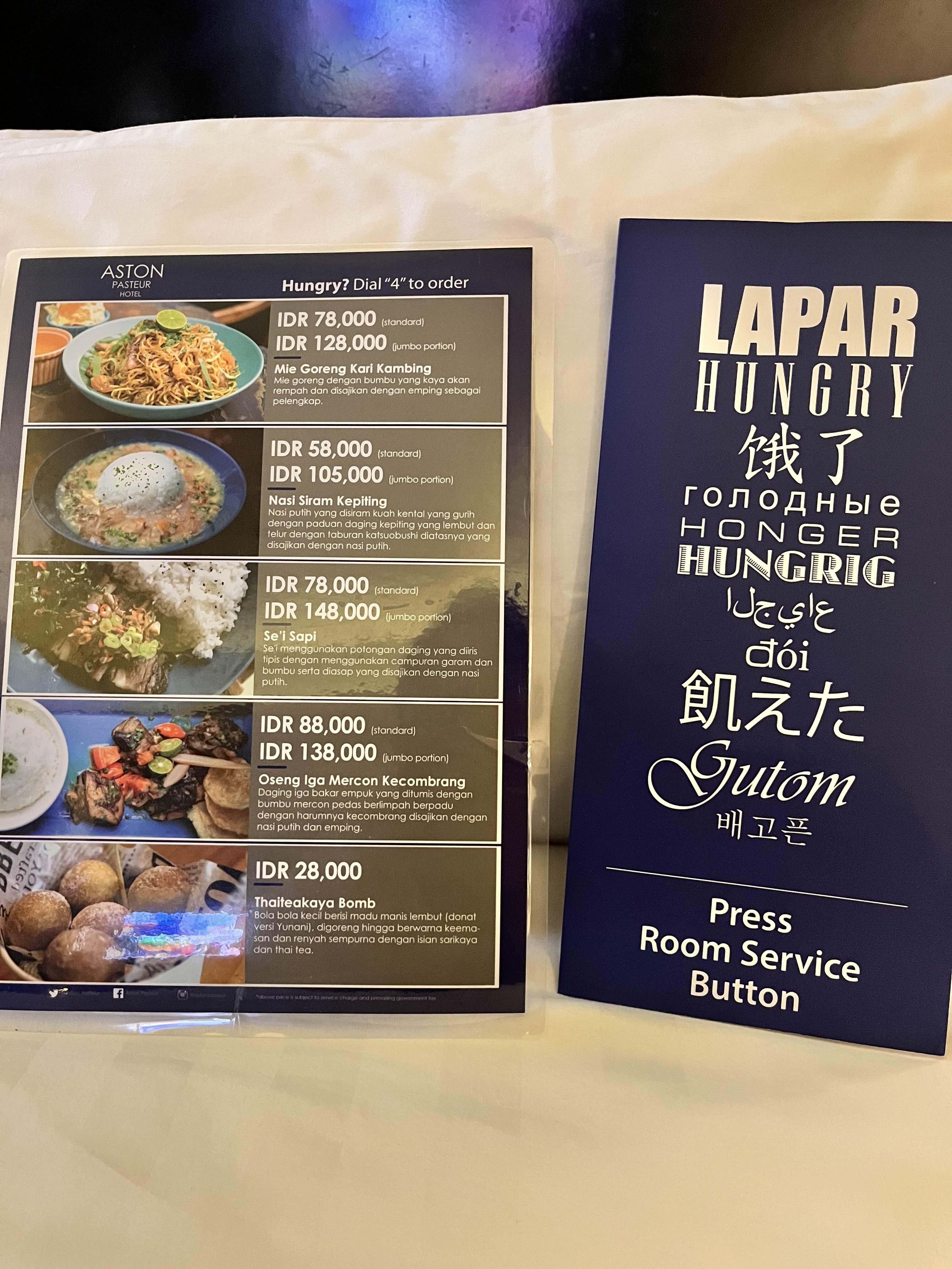 반둥 아스톤 호텔의 룸서비스 메뉴와 가격 그리고 반갑지만 웃긴 한글까지